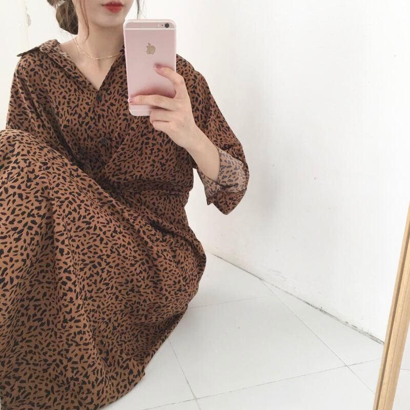 レオパード Vネック シフォン ロングワンピース