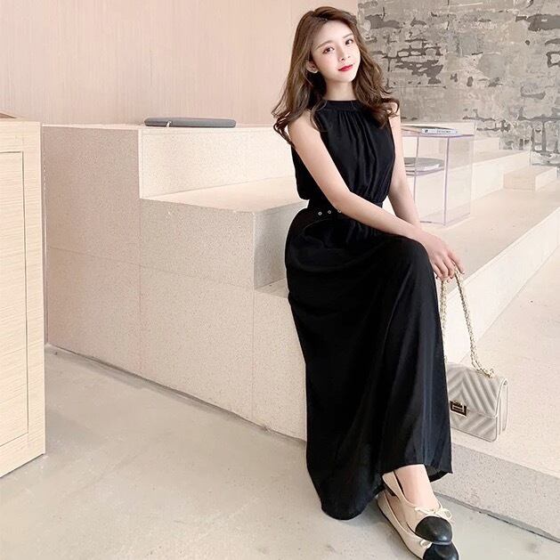 ハイネックノースリーブシフォンワンピース ベルト付き【2色】