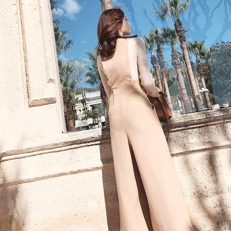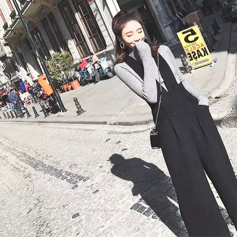 タートルネックニット+ハイウエストストラップワイドパンツ【2色】