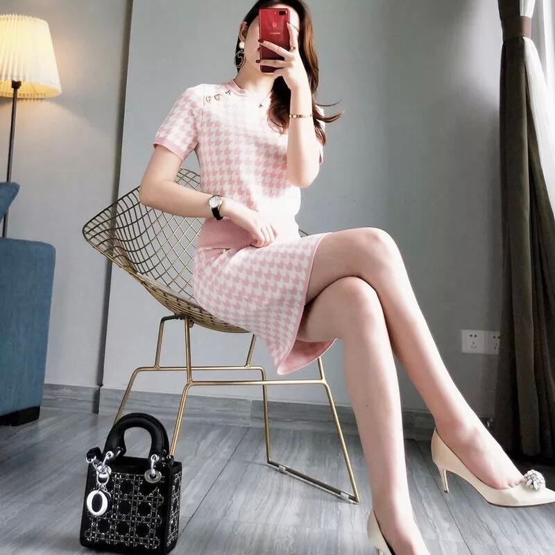 千鳥柄ニット半袖トップス+ハイウエストスカートセットアップ【2色】