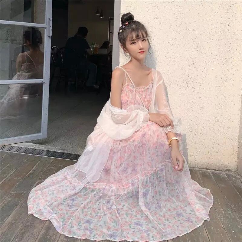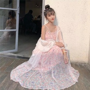 キュート花柄フレアードレス+シフォンカーディガンセット【2色】
