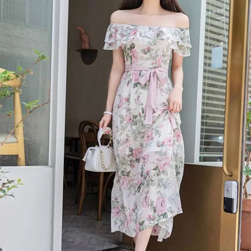 花柄シフォンスラッシュネックワンピース