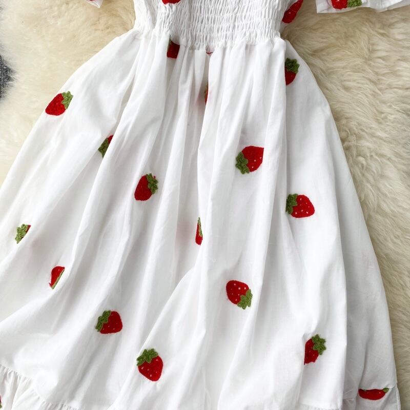 イチゴ・チェリーキュート刺繍パフスリーブワンピース【2色】