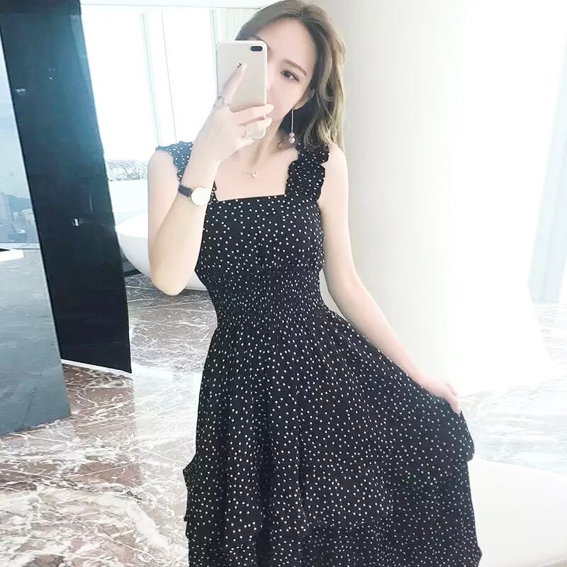 エレガントドット柄スクエアネックシフォンフリルワンピース【2色】