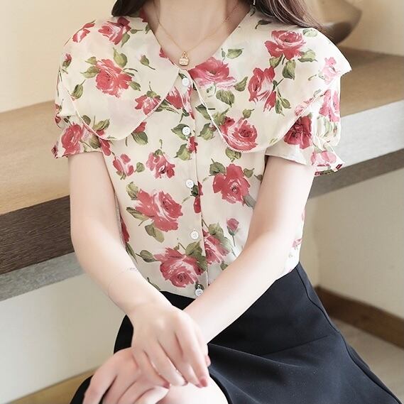 エレガントフラワー柄半袖シフォンブラウス【3色】