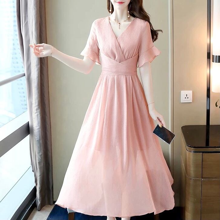 エレガント半袖Vネックシフォンaラインワンピース【3色】