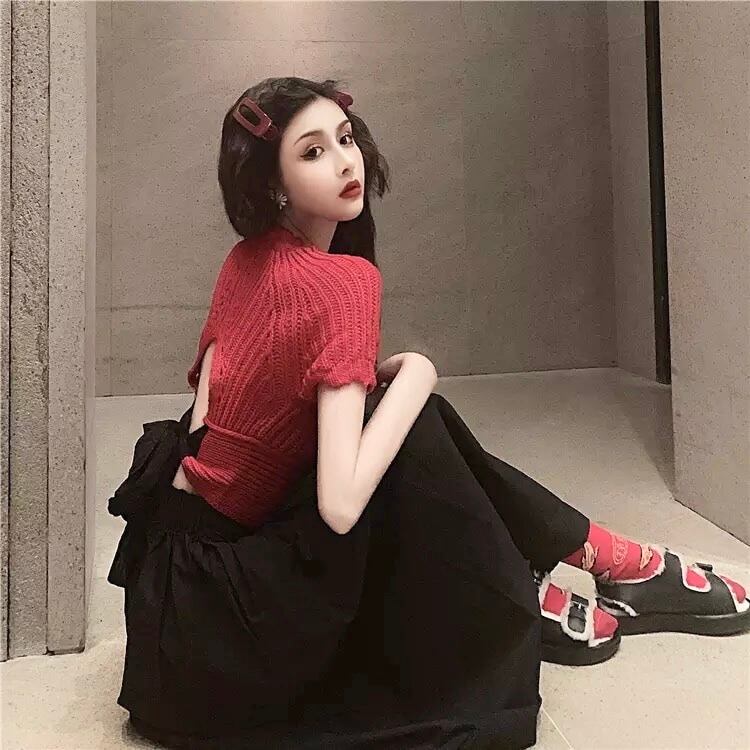 半袖ニットセーターバックリボン+スカートセットアップ【2色】