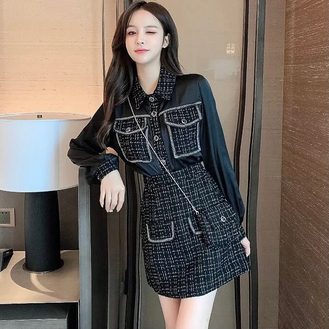 ツイードパッチワークシフォンブラウス+aラインスカートセットアップ(ミニチェーンバック付き)【2色】