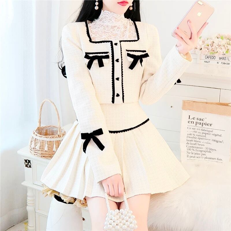 ツイードスクエア襟トップス+プリーツスカートセットアップ【2色】