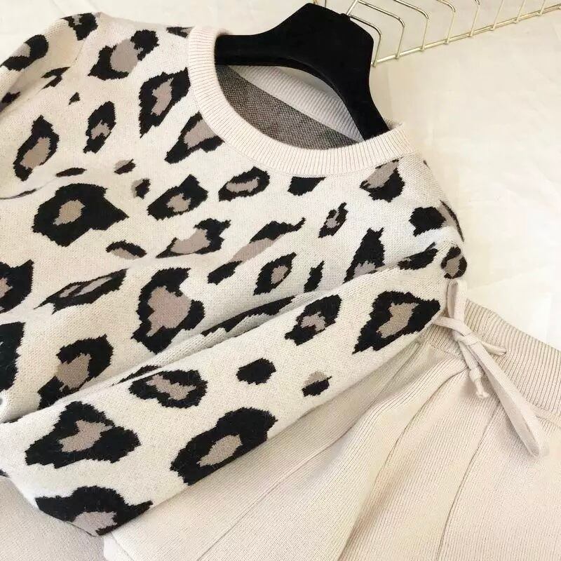カジュアルレオパード柄ニットセーター+ポケット付きハーレムパンツセットアップ【2色】