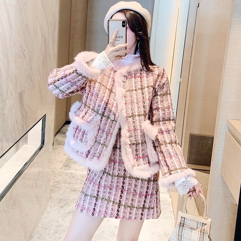 エレガントピンクツイードファー付きジャケット+タイトスカートセットアップ