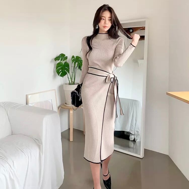 ニット長袖スリムワンピース