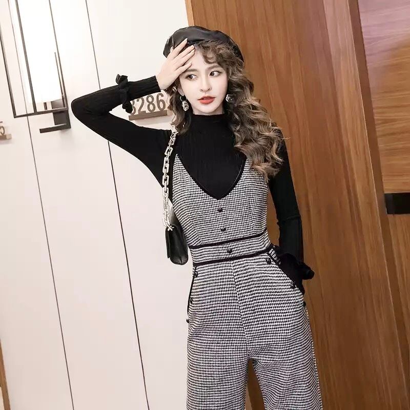 千鳥柄ワイドレッグロンパース+タートルネック2ピース