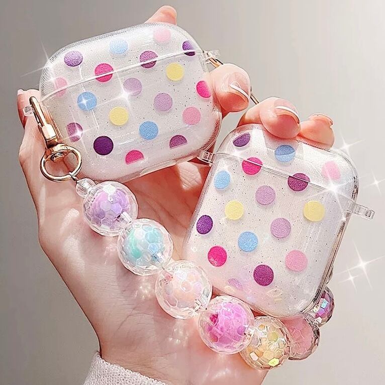 クリアドット柄・ハート柄ラウンドビーズチャーム付きAir podsケース【2色】