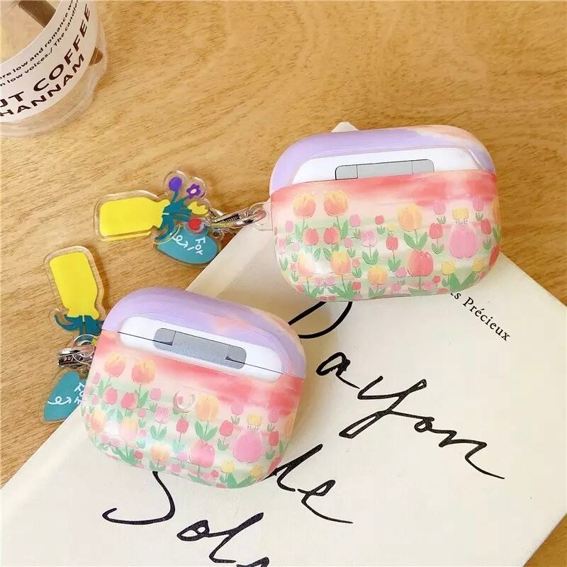 キュートピンクチューリップチャーム付きシリコンAir podsケース