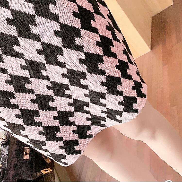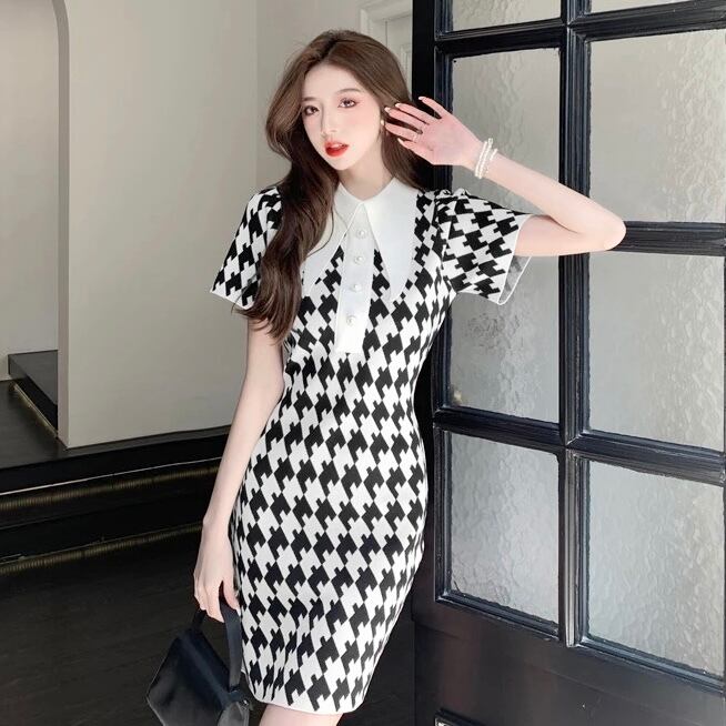 エレガント千鳥柄半袖サマーニットワンピース【2色】
