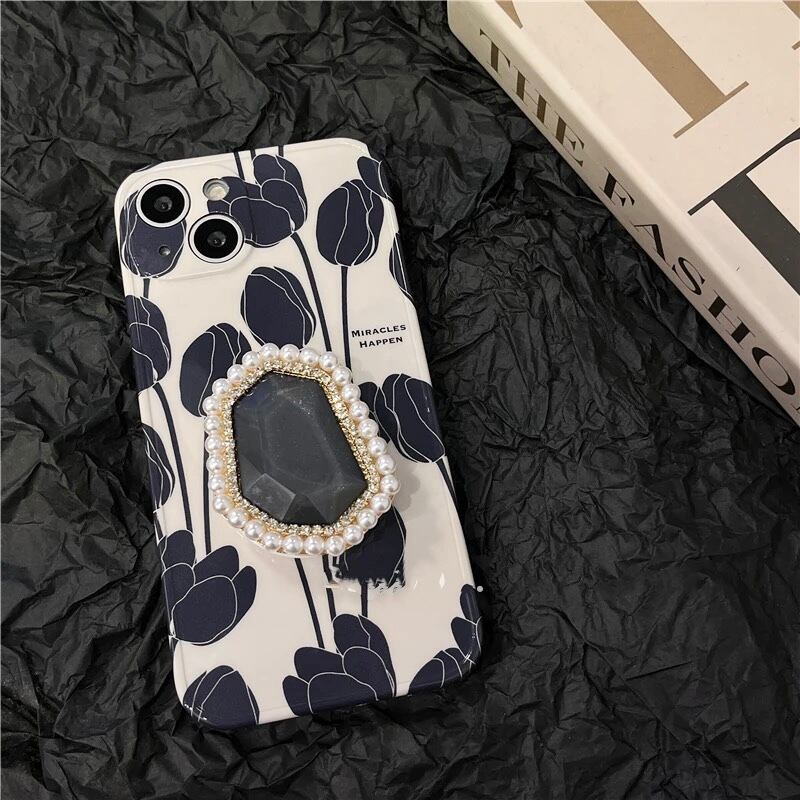 シックなチューリップ柄パールスタンドホルダー付きシリコンiPhoneケース
