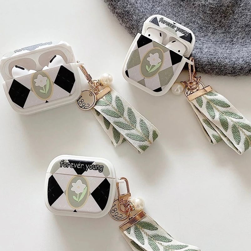 フラワーダイヤ柄パールリーフチャーム付きAir podsケース