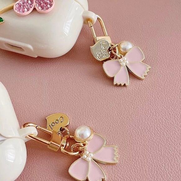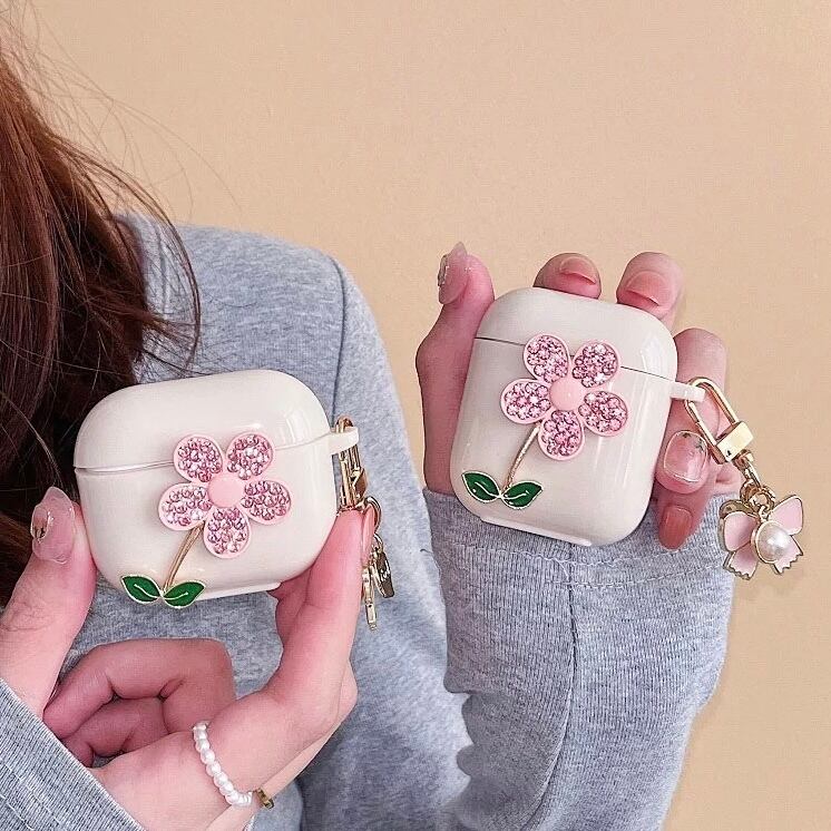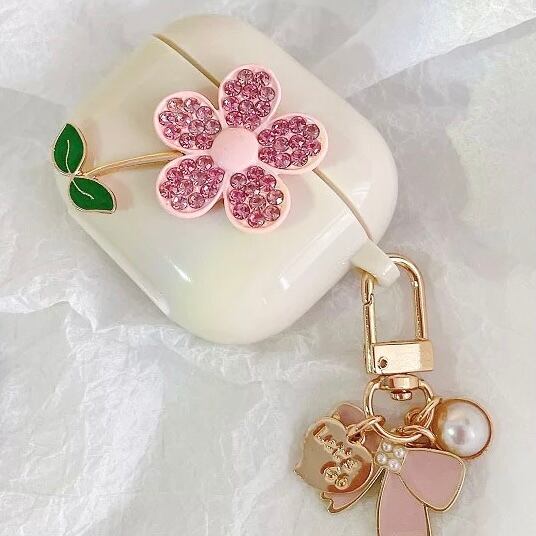 ピンククリスタルフラワーリボンチャーム付きAir podsケース